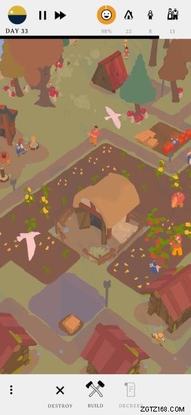 Dorfbewohner brauchen Nahrung und Unterkunft, um zu gedeihen. Wie gut es ihnen geht, können Sie an ihrer allgemeinen Zufriedenheit am oberen Rand des Bildschirms ablesen. Das Smiley-Gesicht zeigt Ihnen, wie es Ihren Dorfbewohnern geht, und glückliche Dorfbewohner bedeuten mehr erledigte Arbeit und höhere Chancen für Babys.