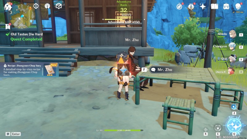 Jetzt haben Sie endlich ein großartiges Gerichtrezept – Zhongyuan Chop Suey, neben anderen Belohnungen wie 150 Abenteuer-EP, 20 Primogems und 20.000 Mora.