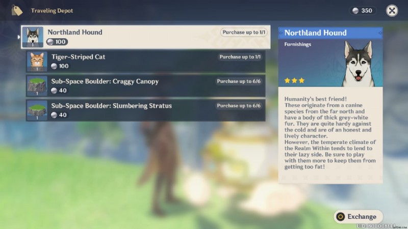 Versuchen Sie, verschiedene Reiche zu besuchen, bis Sie Chubby finden, der den Northland Hound und die Tiger-Striped Cat oder andere Haustiere verkauft.