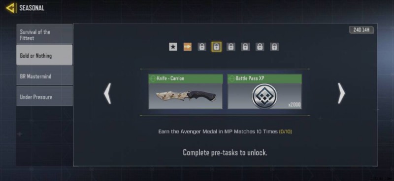 Das Event ist bis zum Ende von Saison 4 gültig; Daher haben die Spieler viel Zeit, um alle Missionen abzuschließen. Gold or Nothing bietet insgesamt sieben Aufgaben, und in jeder Phase können Spieler eine bestimmte Belohnung freischalten.
