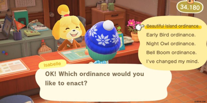 Sie können Verordnungen bei Resident Services erlassen. Sprich mit Isabelle und sie wird dir kurz erklären, dass Verordnungen „passive Effekte“ sind, die die Funktionsweise deiner Insel verändern. Wählen Sie „Inselmerkmale überprüfen“ und dann „Verordnungen besprechen“. Es kostet 20.000 Glocken um eine Verordnung zu erlassen, und sie treten am nächsten Tag in Kraft und gelten so lange, bis Sie sie selbst deaktivieren. Es gibt vier Verordnungen zum Ausprobieren:Beautiful Island, Early Bird, Night Owl und Bell Boom.