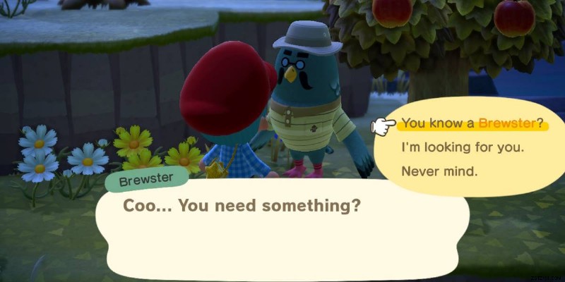 Suchen Sie auf der Insel herum, und Sie sollten Brewster finden, der herumwandert. Sprechen Sie ein paar Mal mit ihm und sagen Sie ihm, dass Blathers nach ihm sucht, und er wird zustimmen, zu Ihrer Insel zu fahren. Bevor du die Insel verlässt, kannst du einen vergrabenen Gyroid ausgraben, wenn du möchtest – es ist immer mindestens einer irgendwo versteckt.