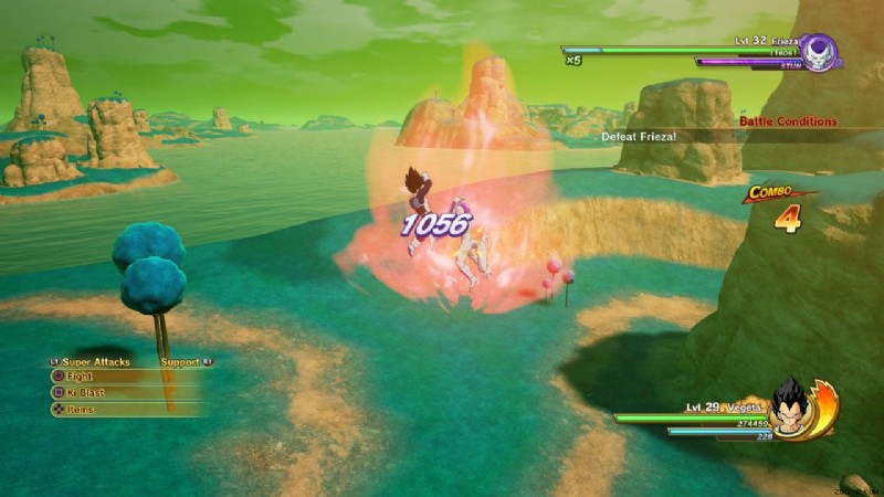 In den letzten beiden Kämpfen steuerst du Super Saiyajin Goku , der viel mächtiger ist als Basis-Goku. Wiederholen Sie die bisher verwendete Strategie, und Frieza wird bald neben Planet Namek verschwinden. Zumindest vorerst.