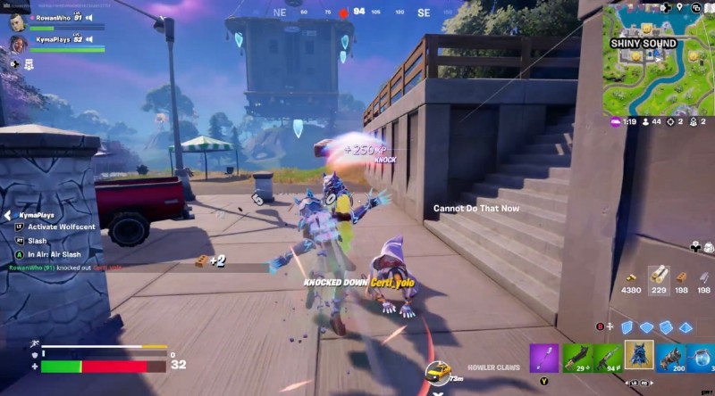Die Howler Claws können verwendet werden, um auf Gegner und Strukturen einzuschlagen und einen Dash-Slash-Angriff (Air Slash) auszuführen. Der Air Slash kann nur ausgeführt werden, während der Spieler mit einer Doppelsprungaktion sprintet. Es ist eine großartige Möglichkeit, sich in die Nähe eines Feindes zu bewegen, kann aber auch verwendet werden, um schnell aus dem Gefahrenbereich des Sturms herauszukommen.