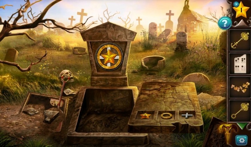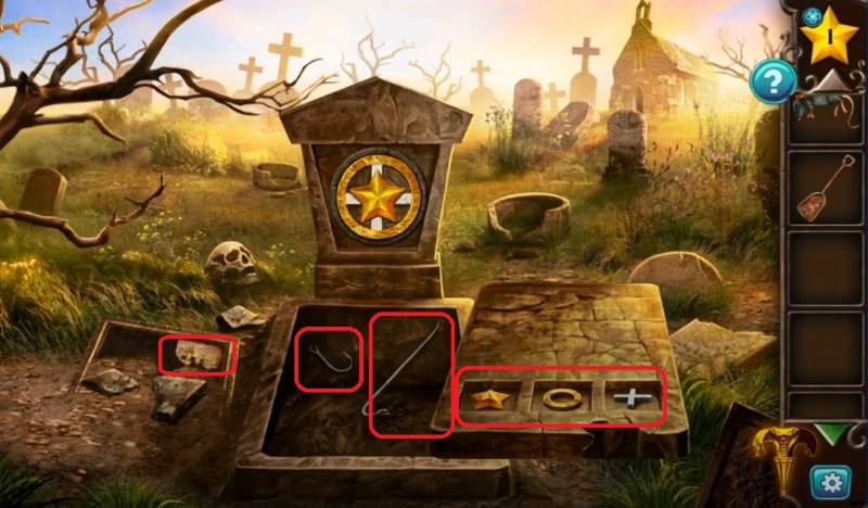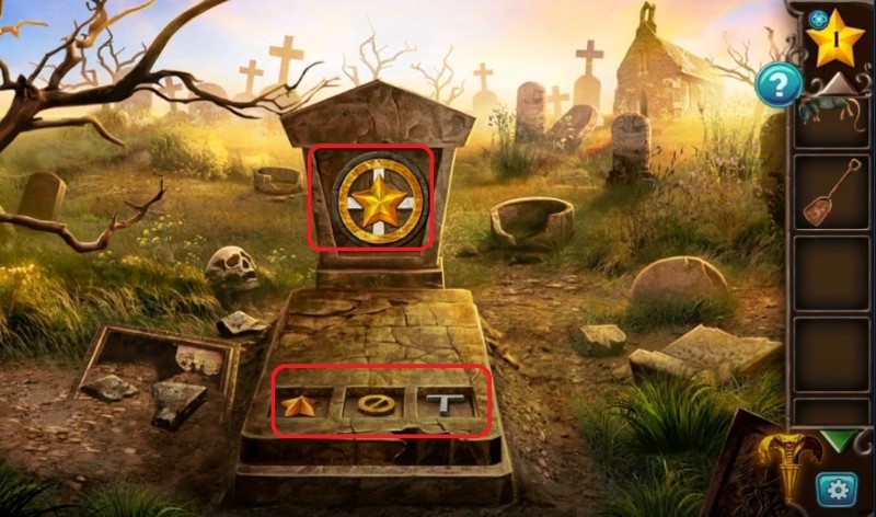 - Wähle die Form aus dem Inventar und platziere sie auf dem Grab, um drei geheime Kisten mit drei verschiedenen Symbolen zu öffnen.