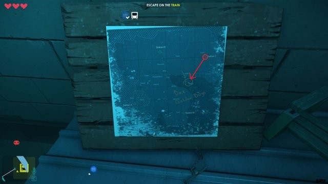 Oben in diesem Bereich gibt es eine Karte, die Sie wahrscheinlich gesehen haben, aber nicht zu viel darüber nachgedacht haben. (oder zumindest glaube ich nicht, dass das irgendjemand getan hat, weil ich sonst nirgendwo etwas davon gesehen habe) Diese Karte hat den Quadranten F4, d3 gepunktet und eingekreist mit einem Pfeil, der darauf zeigt, und dem Untertext von „Bar“ und „Golden Boys“, also lasst uns dort hingehen und sehen, was wir finden.