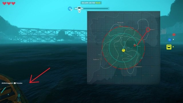 Sobald wir zu diesem Ort reisen (ich habe das ursprüngliche Ziel und den allgemeinen Weg zum Ziel markiert), finden wir uns in einem See mit nichts als Felsen und mehr Wasser um uns herum wieder, aber nach ein wenig Suchen finde ich ein einsames Boot mit einem Munitionskiste darin. Nicht zu sehr mysteriös, aber es wird besser.