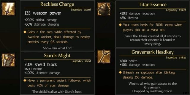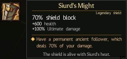 Reckless Charge bewirkt, dass Awaken Ancient eine schädliche Aura erzeugt. Siurds Macht beschwört den Uralten Gefolgsmann, der in den Griff kommt, wenn der Assassine und der Magier niedergeschlagen sind, da der Gefolgsmann Feinde ablenken kann, während der Krieger wiederbelebt wird. Titan-Essenz ermöglicht es dem Krieger, von der Aura von Reckless Charge Lebensraub zu nehmen, was die einzige Möglichkeit ist, zu heilen, während er mit dem Schild blockt, der nicht direkt vom Magier geheilt wird. Der Gravemark Headkey bietet eine hilfreiche Robustheit.