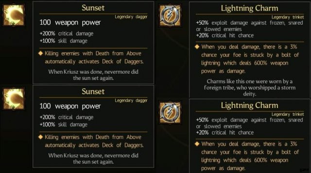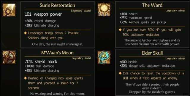 Grimoire of Blight, Titan Skinner, Siurd’s Might, Hollow Ring, Seal of the Banished, Titan Essence, Gravemark Headkey, Mwaans Moon, Elder Skull, Sunset, Lightning Charm und Eye of Kriusz können alle durch Herstellung erworben werden. Einige von ihnen können auch gedroppt werden, du kannst im Bestiarium im Spiel nachsehen, welche Mobs droppen.