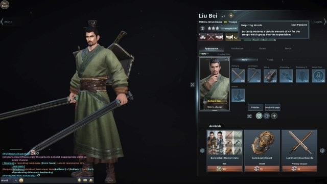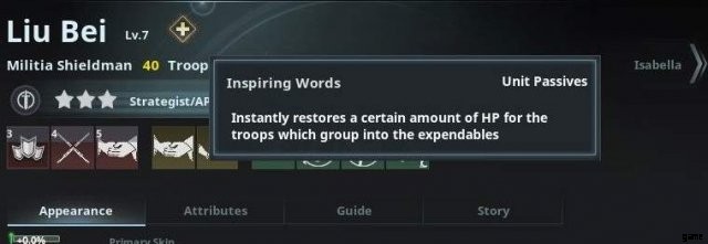 Liu Bei heilt seine Armee, die Armee, die er dank der Fähigkeit aus Verbündeten und Feinden rekrutiert hat, und nur die verbündeten Armeen.
