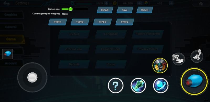 Als Randnotiz können Sie die Grafikeinstellungen des Spiels verringern, wenn Ihr Gerät in einigen Aspekten etwas hinterherhinkt. Wofür wir hier sind, geht jedoch zwei Registerkarten nach unten zu den Spieleinstellungen und den Steuerungskonfigurationen. Es stehen 4 verschiedene Standardlayouts zur Auswahl und ein Schieberegler ist oben links auf der Seite verfügbar, den Sie anpassen können, um jede Schaltfläche zu vergrößern oder zu verkleinern. Beachten Sie, dass Sie jede Schaltfläche auch manuell nach Ihren Wünschen ziehen können. Wenn Sie mit dem, was Sie sich ausgedacht haben, zufrieden sind, denken Sie daran zu speichern, andernfalls tippen Sie auf die Standardschaltfläche, um alles auf den ursprünglichen Zustand zurückzusetzen.
