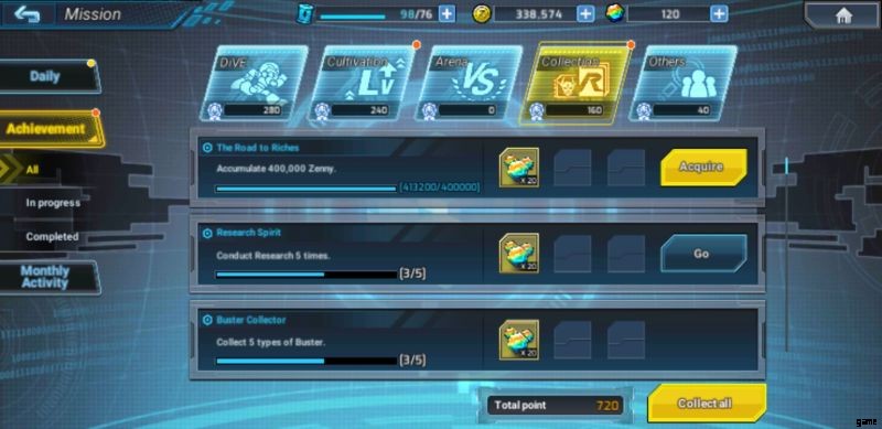 Erfolge hingegen bieten eine einmalige Belohnung pro erreichtem Meilenstein. Oft schaltet das Erreichen eines Ziels ein höherrangiges Ziel frei, das Sie anstreben können, während Sie im Spiel weitere Fortschritte machen. Beachten Sie, dass Erfolge auf fünf separate Registerkarten oder Gruppen verteilt sind. Denken Sie also daran, jeden von ihnen zu überprüfen und Ihre Belohnungen einzufordern. Erfolge sind ebenfalls eine großartige Quelle für kostenlose Elementmetalle, daher ist es sehr empfehlenswert, neue Taten zu vollbringen, insbesondere solche, die leicht zu vollenden sind.
