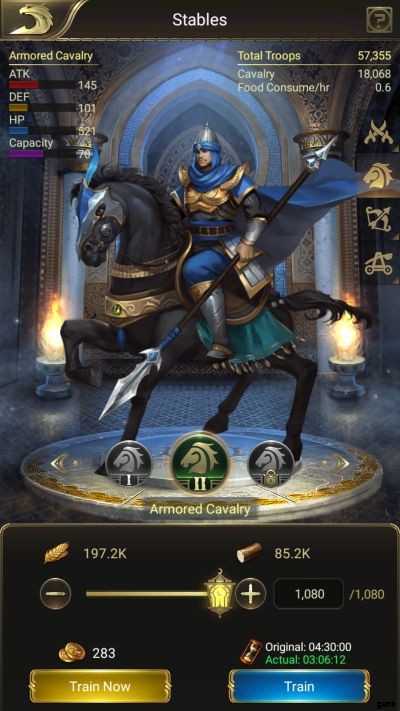 The intel you can get from scouting will allow you to tweak your attacking line-up to potentially counter the defenders or avoid being hit by their strengths. In the screenshot above, we learned that the target has 2 squads of cavalry and 1 squad of siege engine; we can then build a team that are strong against those troop types.