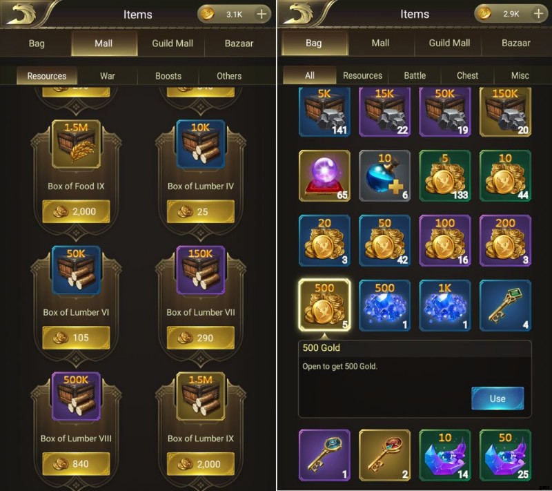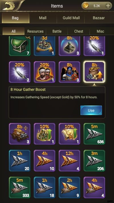 This is an ingenious way to ‘pack’ your resources and store them safely in your inventory. Don’t hesitate to use of up to 500 gold for resetting the offers. The total price of the resources you can save via the Bazaar trick is way too little compared to their actual prices at the Mall. After all, you can easily gain way more than 500 gold daily anyway.