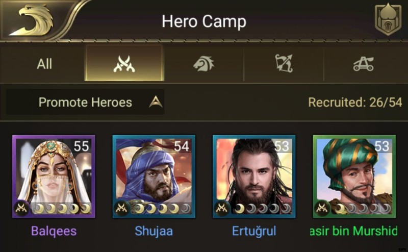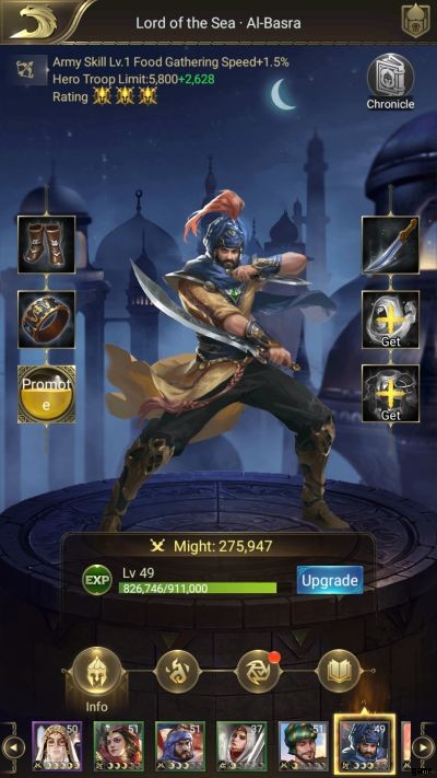 Achte auf die Armeefähigkeiten deiner Helden; Einige geben zusätzliche Geschwindigkeit beim Sammeln bestimmter Ressourcen. Vielleicht möchten Sie Ihre Expeditionsbemühungen mit ihren Stärken ausstatten. Beachten Sie jedoch, dass Boni für Armeefertigkeiten Boosts sind, die sich auf die gesamte Stadt auswirken und nicht auf die Sammelexpedition beschränkt sind, zu der solche Helden geschickt werden.