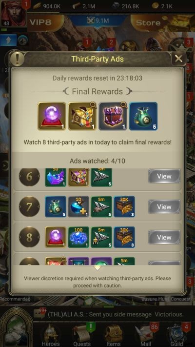 Sie erhalten bis zu 10 Anzeigen für jeden 24-Stunden-Zyklus und die Qualität der Belohnungen ist konstant gut. Die herausragenden sind insgesamt 300 Juwelen, 2 Heldenreliktkisten und 2 Premium-Heldenbeschwörungsrollen. Es wird dringend empfohlen, täglich alle 10 Anzeigen zu konsumieren. Unserer Erfahrung nach hatten wir jedoch ein paar Tage, an denen uns das Spiel auf nur 8 oder 9 „beschränkte“.