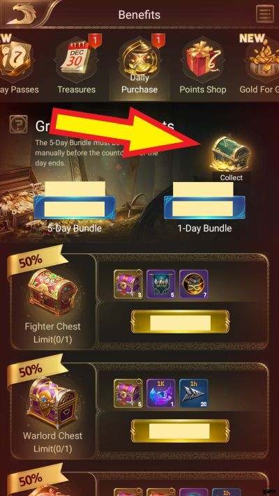 Geheimmarkt: Diese Funktion ist ein süßer Teaser für Spieler, die noch keine echte Währung im Spiel ausgegeben haben. Sie können darauf zugreifen, indem Sie auf die Option Vorteile in der oberen rechten Ecke des Bildschirms tippen (während Sie sich in Ihrer Stadt befinden). Darin sehen Sie Registerkarten, die verschiedene Optionen für Spieler zeigen, für die sie echte Währung ausgeben können. Suchen Sie nach dem Tab „Täglich“ und beanspruchen Sie die kostenlose Truhe.