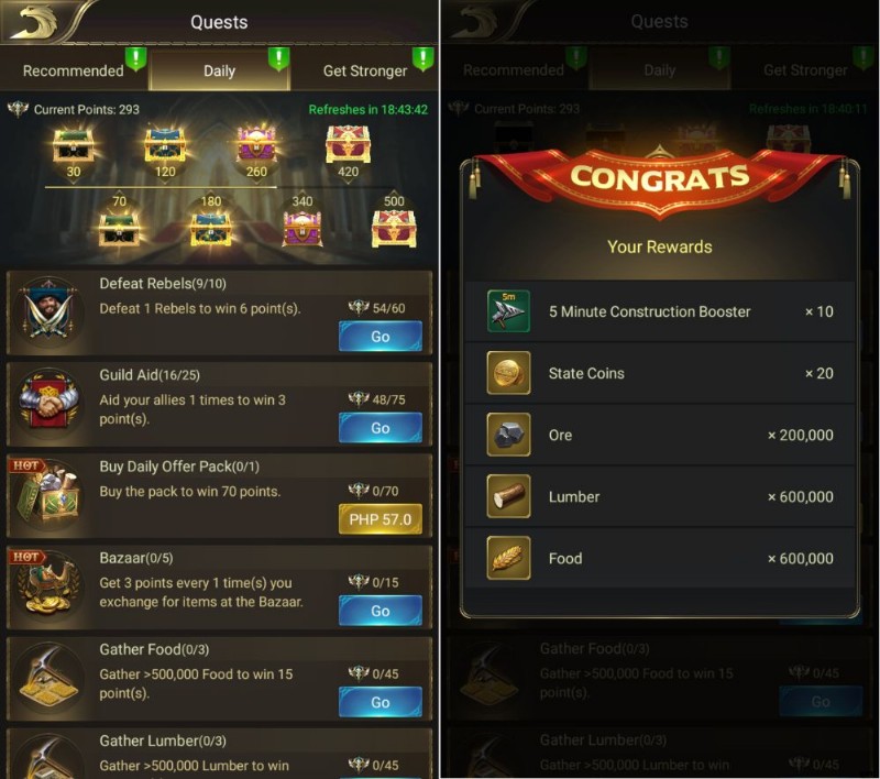 A: All of the chores mentioned in the Daily tab of Quests clearly mention their individual conditions; the confusing ones are those asking to gather resources. The sure way to do those is to clear at least a level 4 farm, sawmill, or mine to meet the ones requiring 500,000 food and wood and 50,000 ore (that’s three separate nodes for each in total).