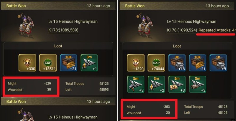 – Die Verluste an Macht und Truppen, die Sie im Kampfbericht sehen, sind kein fester Betrag; Es kann schwanken, selbst wenn Sie ständig gegen einen Rebellen eines bestimmten Levels kämpfen. Wenn Sie Glück haben, erleiden Sie manchmal überhaupt keinen Schaden.