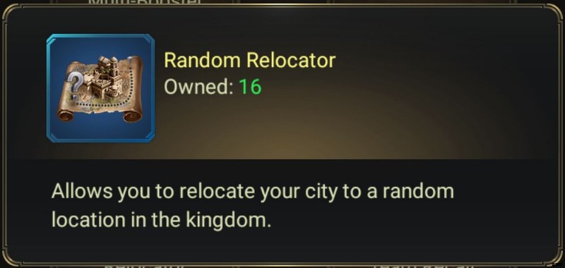 Acts in the same way as Fly Wing in Ragnarok:Eternal Love, this item randomly teleports you which you can use for escaping tight situations. Attacks and scouting commands meant for your city has a certain distance breaking point when you move. The key is to keep using the relocator and be more than 300 miles away from the source of attack/scouting.