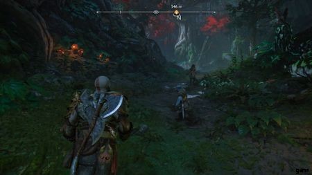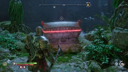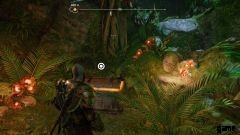 Gehen Sie weiter geradeaus und Sie werden auf eine Nornir-Truhe stoßen. Das erste Ziel befindet sich zu Ihrer Linken; Werfen Sie Ihre Axt, um sie so zu drehen, dass die Rune, die wie ein C aussieht, sichtbar ist. Das nächste Ziel befindet sich rechts von der Brust; Verbrenne die Dornen, die es blockieren, und drehe es dann so, dass die Rune, die wie ein N aussieht, sichtbar ist. Das letzte Ziel befindet sich dort, wo Sie dieses Gebiet betreten haben. Gehen Sie zurück, schauen Sie nach oben, und Sie werden es sehen. Es ist auch mit Brombeersträuchern bedeckt, aber Sie können sie mit Ihren Blades of Chaos nicht erreichen. Glücklicherweise tragen die Brombeersträucher nach links hinüber. Verbrenne sie dort und das Feuer wird das Ziel erreichen. Drehen Sie das Ziel so, dass die Rune, die wie ein R aussieht, zu sehen ist. Öffne jetzt die Truhe und hol dir dein Horn of Blood Mead.