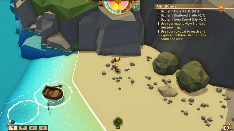 Sie können die drei Inseln in beliebiger Reihenfolge besuchen, aber wir beginnen zuerst im Nordwesten. Markieren Sie es auf Ihrer Karte und auf dem Bildschirm erscheint ein hilfreicher Pfeil, der Sie beim Rudern führt. Steigen Sie an der Ostküste aus und begeben Sie sich ins Landesinnere. Unterwegs suchen Sie in Kisten nach Rohrzucker, Karotten, Auberginen, Metallabfällen und anderen Gegenständen.