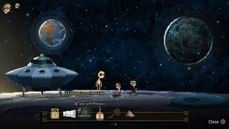 Verwenden Sie die Plastiktüte mit dem Kot auf der Straße. Verwenden Sie dann das Motorrad erneut, um zur Westbrücke zurückzukehren. Verlassen Sie die Westbrücke. Es gibt jetzt einen dritten Schritt, um Princess wiederzubeleben, aber Sie können Ihren bisherigen Fortschritt überprüfen, indem Sie das Interplanetary Beacon verwenden und zur Selenite zurückkehren.