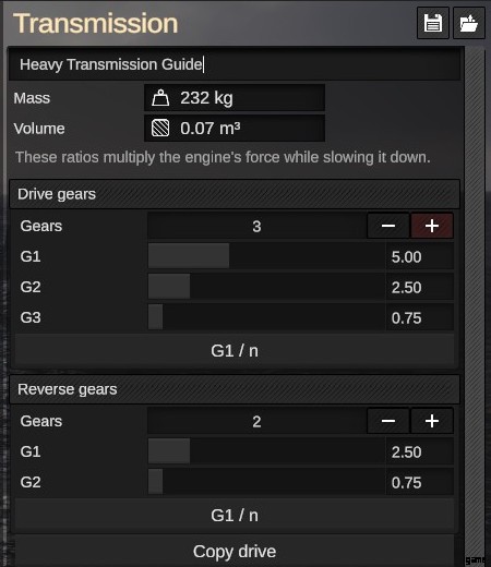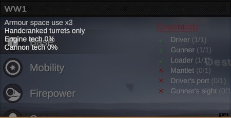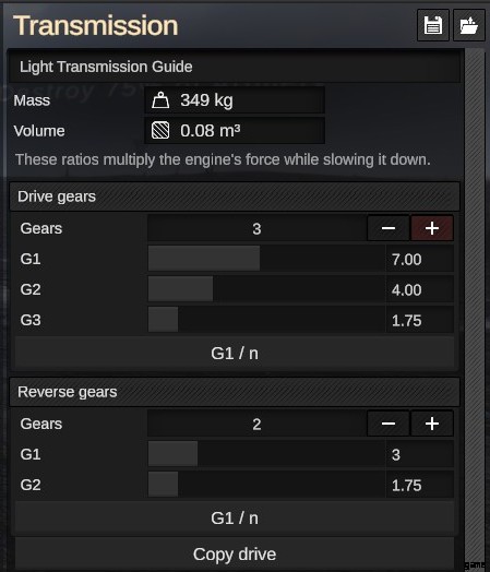 Szenarien, die während der frühen Panzerentwicklung festgelegt wurden, begrenzen die Kapazität von Getrieben. Für „No Tanks Land“ sind Sie auf 3 Vorwärtsgänge und 2 Rückwärtsgänge beschränkt. Beim Anpassen der Übersetzungsverhältnisse, um ein Überdrehen des Motors zu verhindern, ist der erste Übeltäter normalerweise der höchste Gang. Die Lösung besteht dann darin, das Übersetzungsverhältnis zu reduzieren, bis der Motor mit einer geeigneten Drehzahl läuft. Bis die Spielerbasis ein solides Verständnis der Spielmechanik entwickelt, stelle ich mir vor, dass das Übertragungsdesign ein Prozess von Versuch und Irrtum bleiben wird.