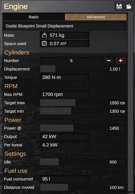Triebwerke werden normalerweise durch feindliches Feuer oder durch Überschreiten der maximalen Drehzahl (rote Linie) ausgebrannt und versagen. Zwei Elemente müssen verwaltet werden, der Motor selbst und das Getriebe. Unten ist ein Beispiel für einen kleinen Satz kleiner Motorparameter für „No Tanks Land“-Konstruktionsbeschränkungen aus dem 1. Weltkrieg.
