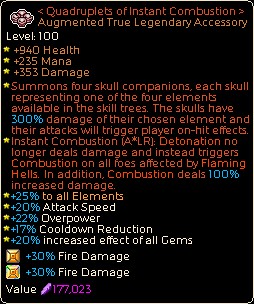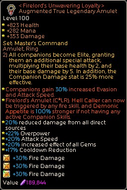 Amulett des Feuerfürsten LR (hergestellt) – Höllenrufer wird jetzt jedes Mal ausgelöst, wenn wir Detonation wirken, und da Quadruplets nicht als „Gefährtenfähigkeit“ zählt, verstärkt es auch den dämonischen Appetit.