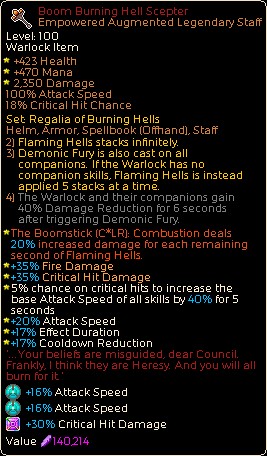 Erstens lässt es Flammende Höllen unendlich stapeln. Während diese passive Fähigkeit besagt, dass sie nur durch eine Warlock-Feuerfertigkeit ausgelöst werden kann, funktioniert sie in Wirklichkeit auch mit dem Feuerschädel von Quadruplets, da sie von Natur aus berechtigt sind, Treffereffekte des Spielers auszulösen. Der 3-Teile-Bonus des Sets verstärkt diese Synergie weiter, da die Schädel als Gefährten zählen, aber nicht als Gefährten-Fähigkeit, wodurch Flammende Höllen fünfmal für jeden auslösenden Treffer gestapelt werden können. Das Set aktiviert auch eine Mechanik des dämonischen Zorns, die dieser Build vollständig ignoriert.