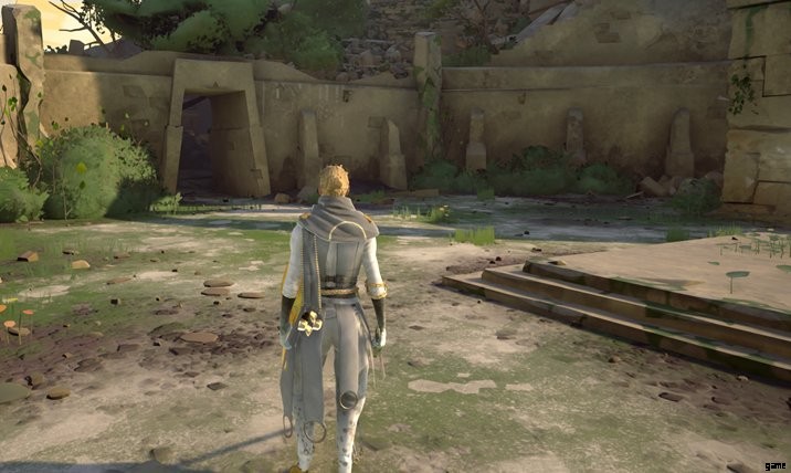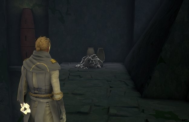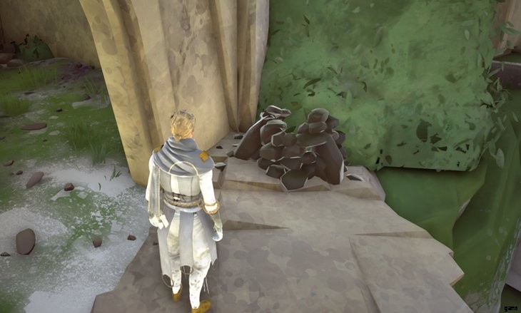 - Gehe durch die beiden kleinen Torbögen, um den Steinhaufen zu finden.