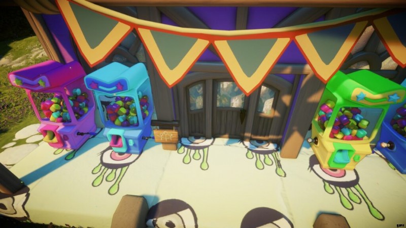 Beachten Sie, dass nur die hier abgebildeten rosa und grünen Verkaufsautomaten zufällig Hüte fallen lassen – die blauen Automaten werden stattdessen seltene Perücken/Frisuren und Farbstoffe fallen lassen. (Natürlich besteht immer die Möglichkeit, dass Sie von einem der Automaten nur einen Trostpreis erhalten, das können zum Beispiel Schlüssel oder Batterien sein.)