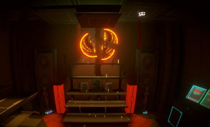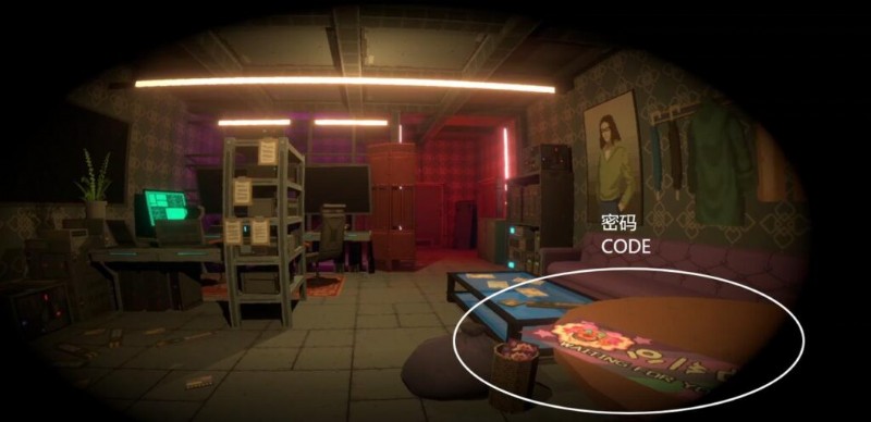 Gehe in den zweiten Stock. Ganz rechts finden Sie eine Tür, die einen Code erfordert. Sie können die Zeichen verwenden, die Sie im Erdgeschoss gesehen haben.
