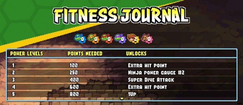 Drücken Sie X auf der Weltkarte, um Turtle Lair zu öffnen, und gehen Sie dann zum Fitness-Journal, um Ihr Charakterlevel und Ihre Upgrades anzuzeigen. Spiele den Story-Modus mit verschiedenen Charakteren, um sie alle auf Level 10 zu verbessern.