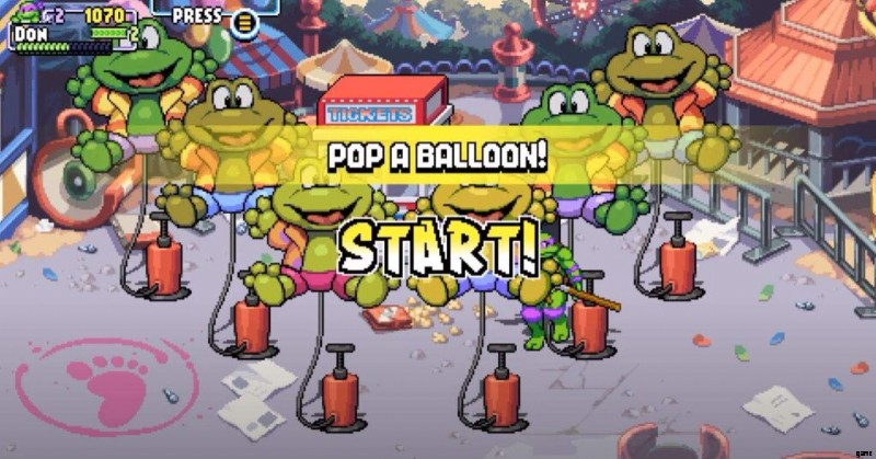 Kurz vor Ende der Etappe sehen Sie 6 Frosch- (oder Schildkröten-) Luftballons. Sie müssen die Pumpe schlagen und bis der Ballon platzt. Iss die Pizza, die aus dem Ballon fällt, und du erhältst den Erfolg.