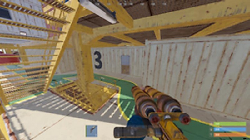 Sobald die Wissenschaftler frei sind, öffnen Sie die Öffnung gegenüber der, durch die Sie eingetreten sind, und hüpfen Sie die 2 Fässer gegenüber dieser Öffnung hoch, auf den gelben Balken links von den Fässern, gehen Sie zum Ende des gelben Balkens und springen Sie an der Öffnung zu Links von der Leiste befindet sich eine Kante, an der Sie sich festklammern können.