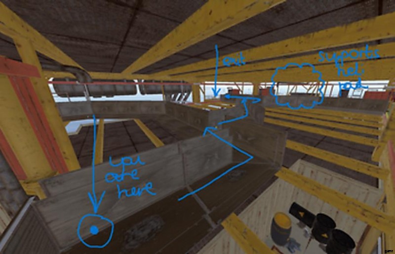 Verlassen Sie diese Öffnung und hocken Sie sich die Streben hinauf, die den Hubschrauberlandeplatz hochhalten, und auf die nächste Ebene (L5).
