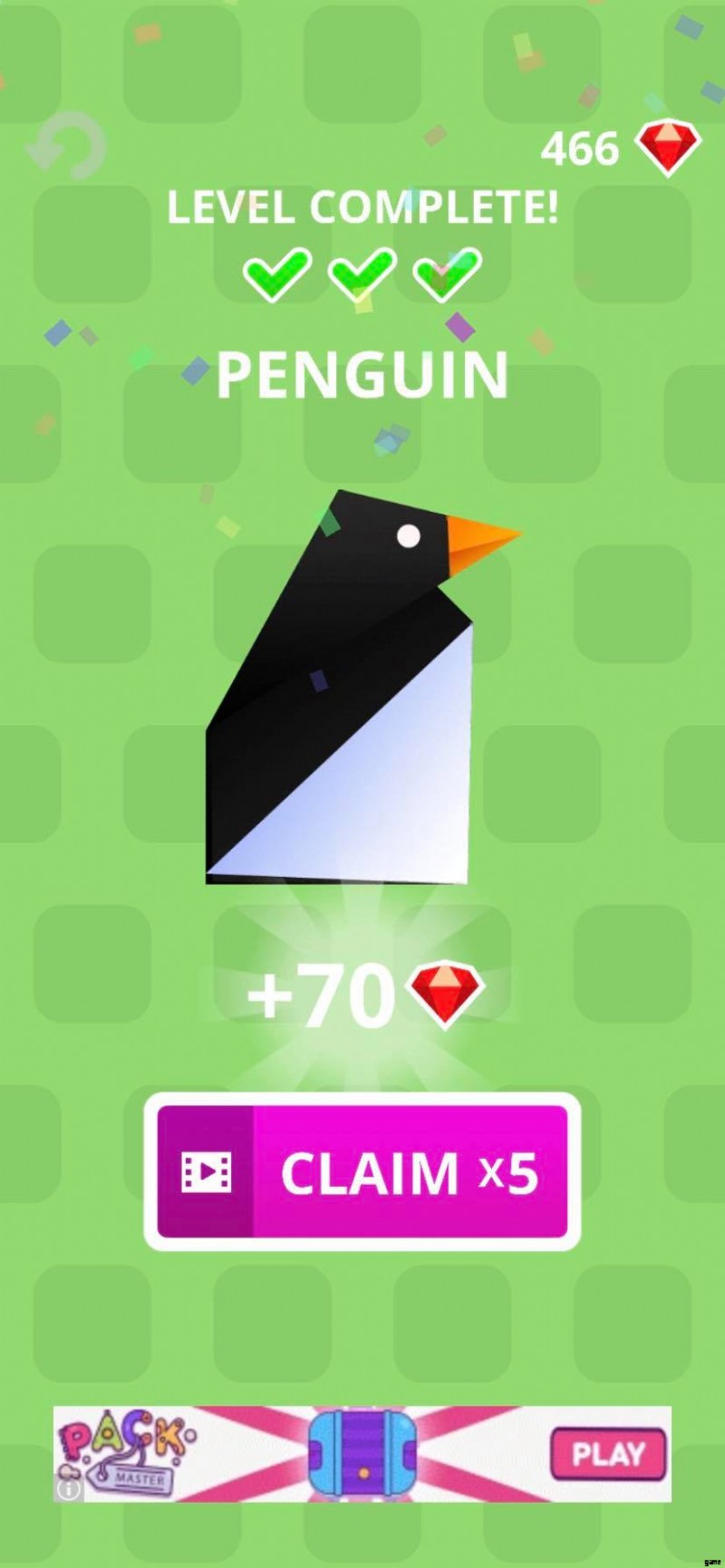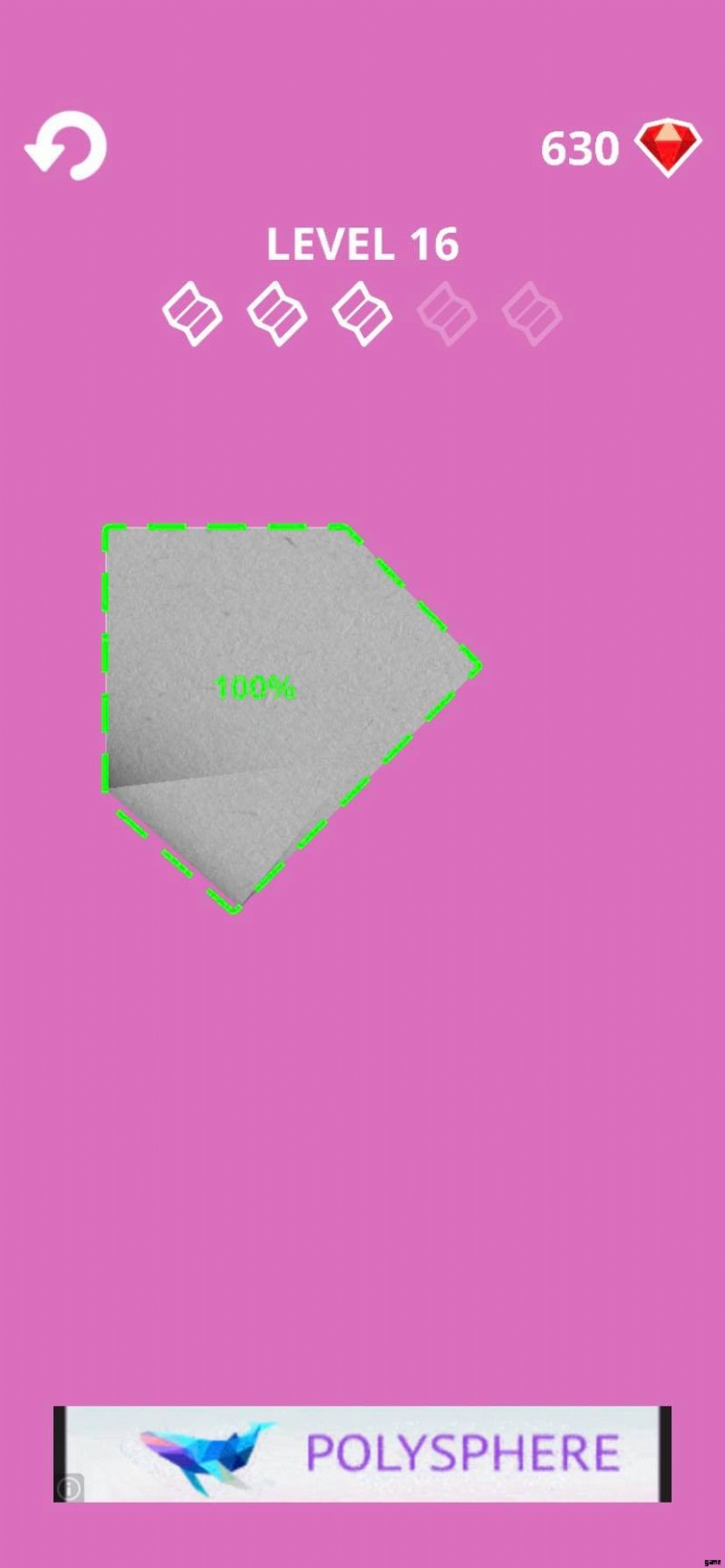 - Ziel:100 %. Je näher Sie Ihrem Origami zu 100 % kommen, desto mehr Edelsteine erhalten Sie. Verwenden Sie diese Edelsteine, um Skins freizuschalten, die das Falten des Papiers optisch ansprechender machen.